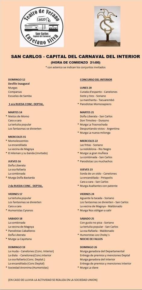 * ATENCIÓN: VIERNES 17/2: SE SUSPENDEN TODAS LAS ACTIVIDADES EN LOS TABLADOS DEL DEPARTAMENTO. ÚNICAMENTE SE TRASLADAN LAS ACTUACIONES DE LAS MURGAS LOCALES (NO CAPITALINAS), del Teatro Cayetano Silva al Teatro Sociedad Unión.