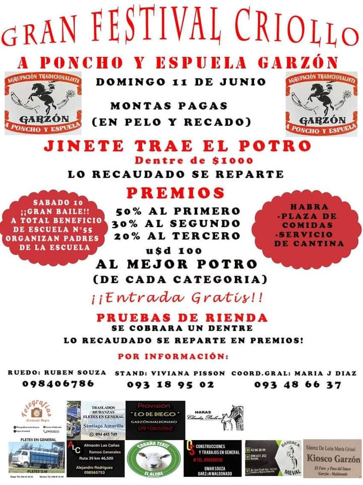 Organiza: Agrupación Tradicionalista "A poncho y espuela Garzón" * Entrada gratuita * Pruebas de rienda - Plaza de comidas * Sáb.10/5 - Baile a beneficio de la Escuela N°55