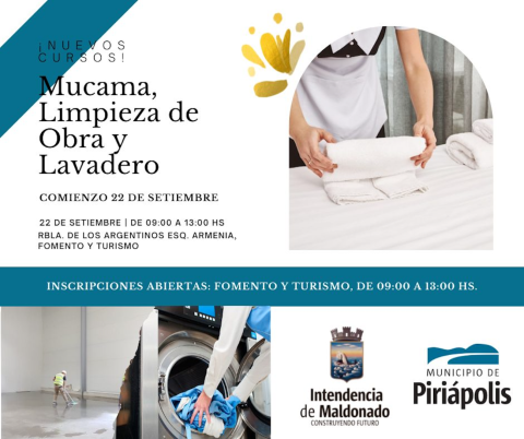 La Oficina de Desarrollo e Integración Social del Municipio de Piriápolis comunica que están abiertas las inscripciones para los cursos de mucama, limpieza de obra y lavadero de la Dirección General de Desarrollo e Integración de la intendencia.
