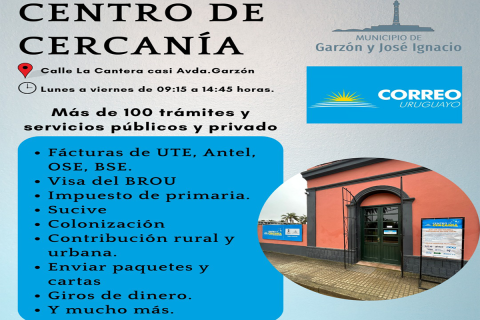 Entre los trámites y servicios disponibles está el pago de facturas (UTE, Antel, OSE, BSE); solicitud de visa BROU; Impuesto de Primaria; Sucive; Colonización; Contribución rural y urbana; envío de paquetes y cartas y giros de dinero