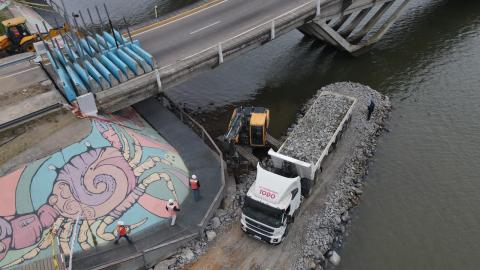 Esta primera parte de los trabajos previstos demandará un mes y medio y se requerirán unos 200 camiones de piedra para armar cuatro ataguías que son diques con los cuales se busca llegar al punto necesario sobre el Arroyo Maldonado e instalar los pilares que permitirán apuntalar el puente. La reparación definitiva se hará en segunda etapa y se prevé que sea después de la temporada.