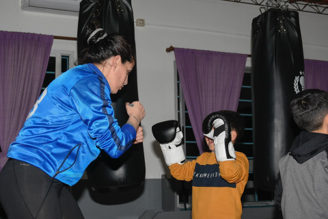 En el Centro Comunal del barrio Santa Teresita, Gabriela Bouvier entrena niños, adolescentes y mayores.