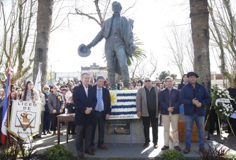 El jefe comunal colocó la ofrenda floral al pie del monumento a José Gervasio Artigas acompañado por los diputados de todos los partidos del departamento: Diego Echeverría, Federico Casaretto, Gabriel Gurméndez y Joaquín Garlo.