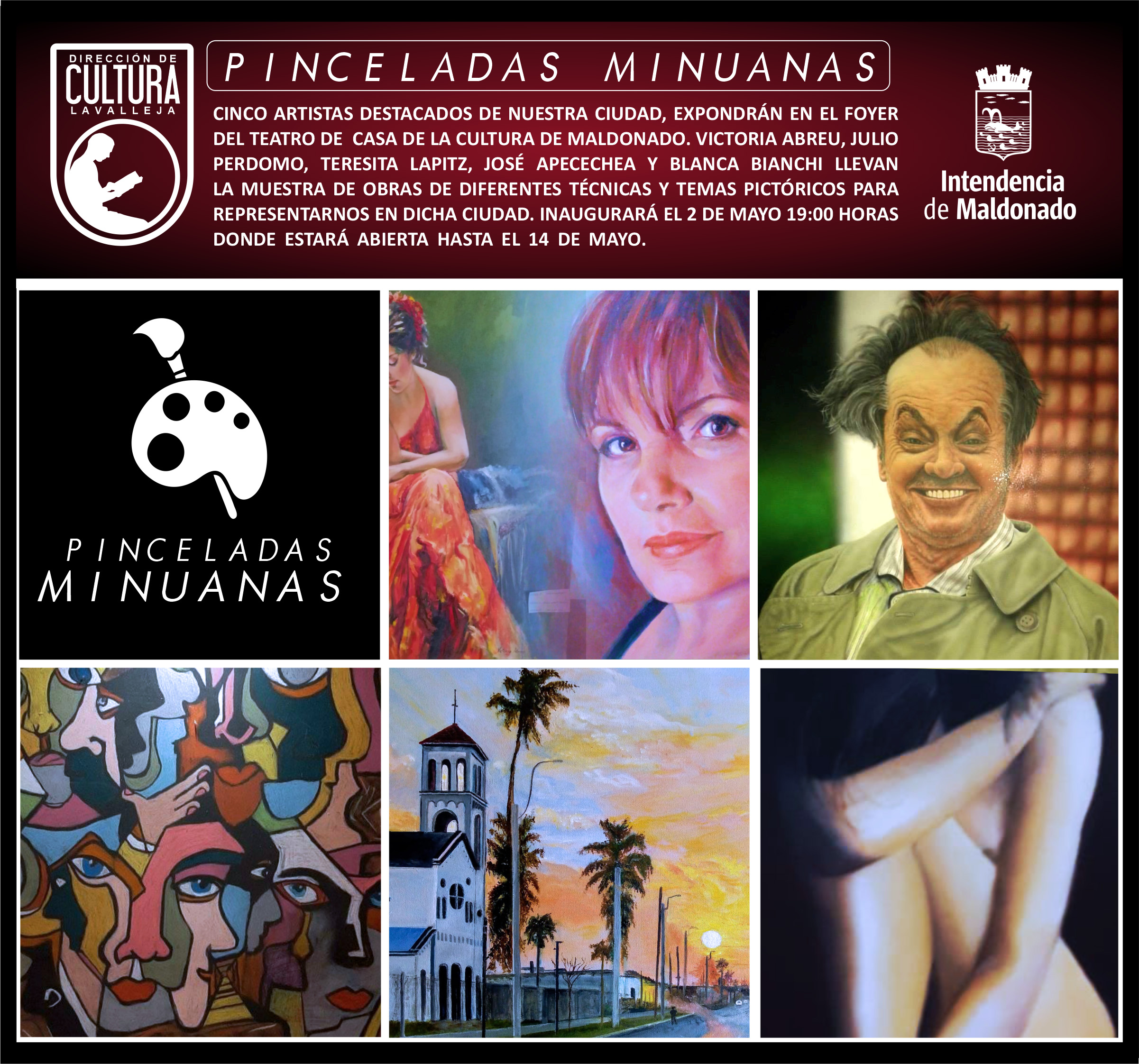 La muestra incluye obras pictóricas de los artistas minuanos Victoria Abreu, Julio Perdomo, Blanca Bianchi, Teresita Lapitz y José Apecechea, y se podrá visitar de lunes a viernes, en el horario de 10 a 17 con entrada gratuita.