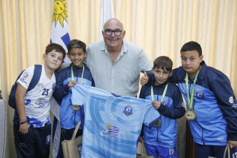 Durante la reunión los niños le obsequiaron al intendente Miguel Abella una camiseta igual a la que utilizaron en el torneo y recibieron de parte del jefe comunal accesorios para sus próximas actividades deportivas.