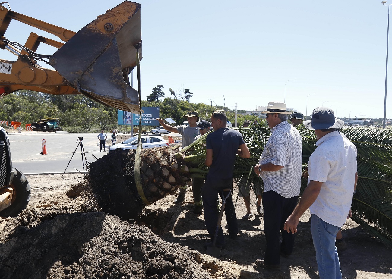 El intendente de Maldonado, Enrique Antía, fue parte del proceso de colocación de las palmeras especialmente elegidas para enaltecer la entrada a la ciudad y dando seguridad al tránsito al mantener despejadas las zonas circundantes de la rotonda.