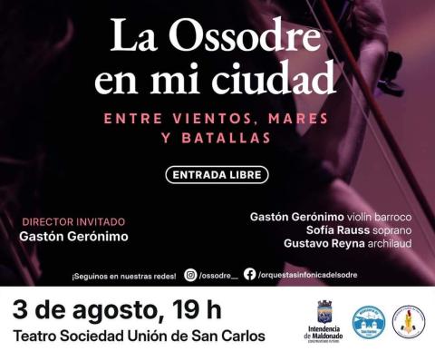 En el marco de un aniversario de la fundación de San Carlos, la Orquesta Sinfónica del Sodre presentará su show denominado “Entre vientos, mares y batallas”. El espectáculo será este sábado 3 de agosto a las 19 horas con entrada libre y gratuita.