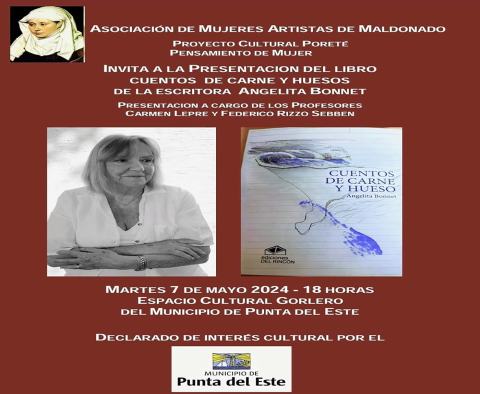 Este martes 7 de mayo a la hora 18 en el Espacio Cultural Gorlero, la Asociación de Mujeres Artistas de Maldonado lanzará el libro "Cuentos de carne y hueso" de Angelita Bonnet.