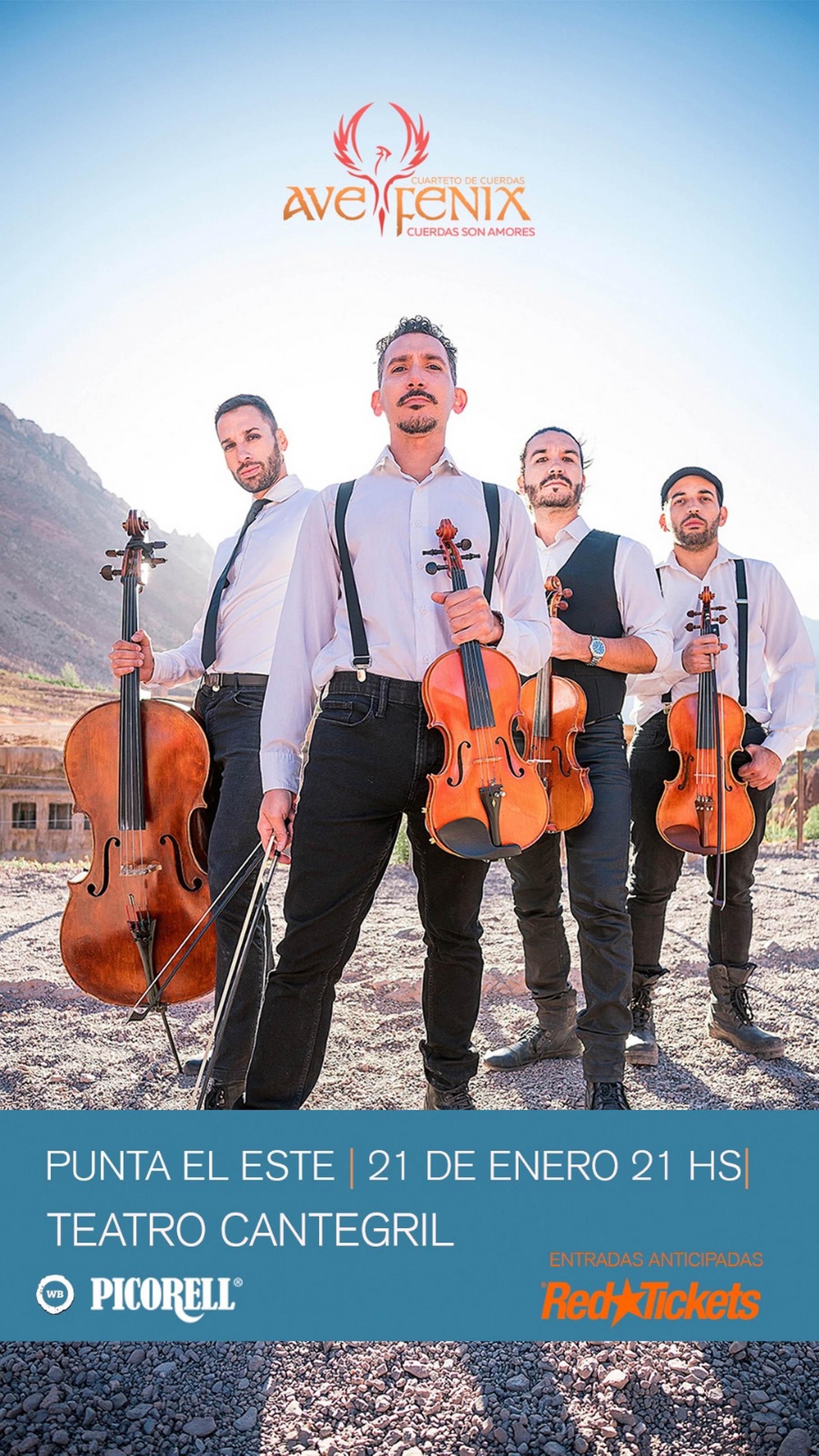 Y el domingo 21, también a la hora 21, se presentará Ave Fénix. El cuarteto de cuerdas argentino, de nivel internacional, está conformado por: Pablo Raffo -viola-, Valter Izzo -primer violín-, Javier Kase -segundo violín- y Nicolás Muñoz -cello-. Los músicos interpretan diferentes géneros musicales -pop, rock, electrónica y música de cine- con sus clásicos instrumentos de cuerdas. El precio de la entrada es de 1260 pesos y está a la venta mediante RedTickets, al igual que una hora antes de la función en la Boletería del Teatro.