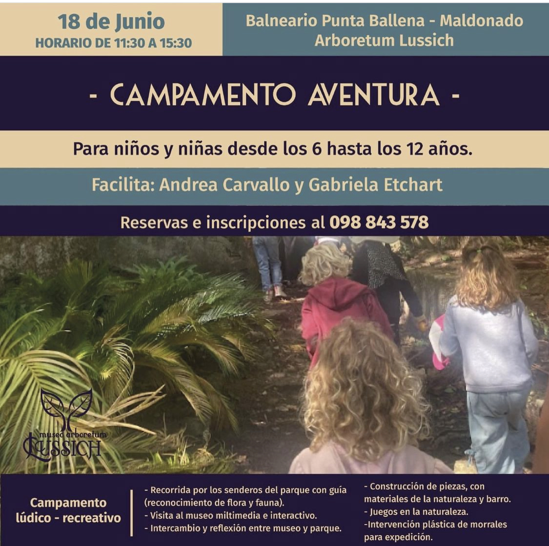 Actividades lúdico-recreativas dirigidas por Andrea Carvallo y Gabriel Etchart. * Para niños/as de 6 a 12 años * Reservas e inscripciones: 098 843 578