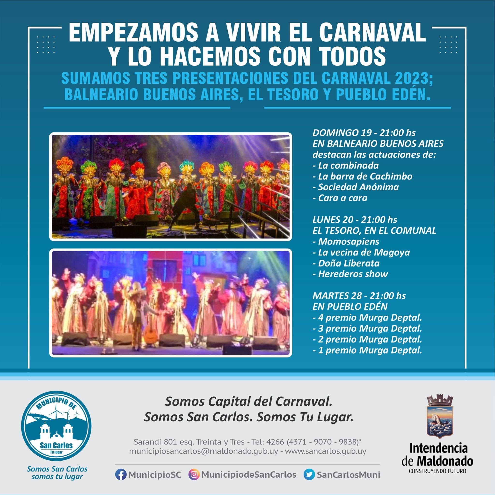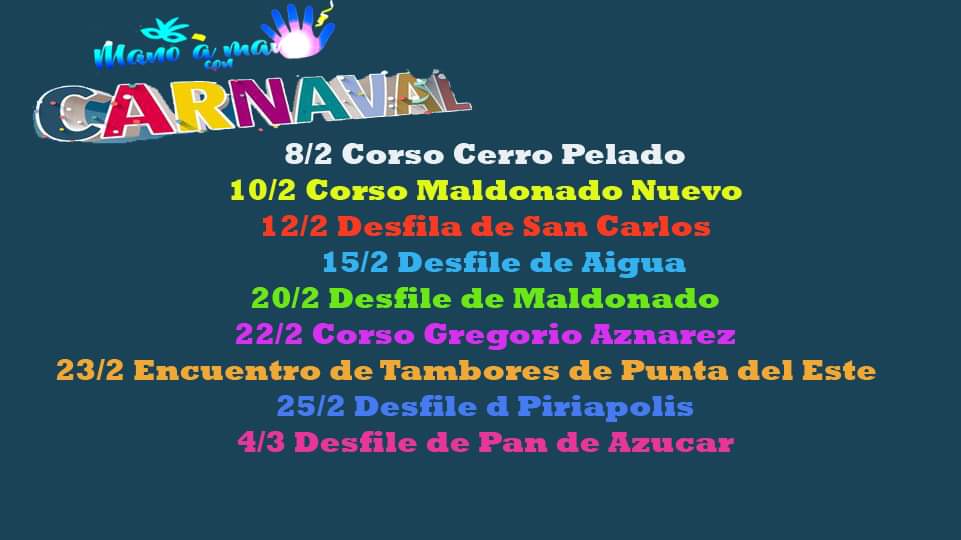 * ATENCIÓN: VIERNES 17/2: SE SUSPENDEN TODAS LAS ACTIVIDADES EN LOS TABLADOS DEL DEPARTAMENTO. ÚNICAMENTE SE TRASLADAN LAS ACTUACIONES DE LAS MURGAS LOCALES (NO CAPITALINAS), del Teatro Cayetano Silva al Teatro Sociedad Unión.