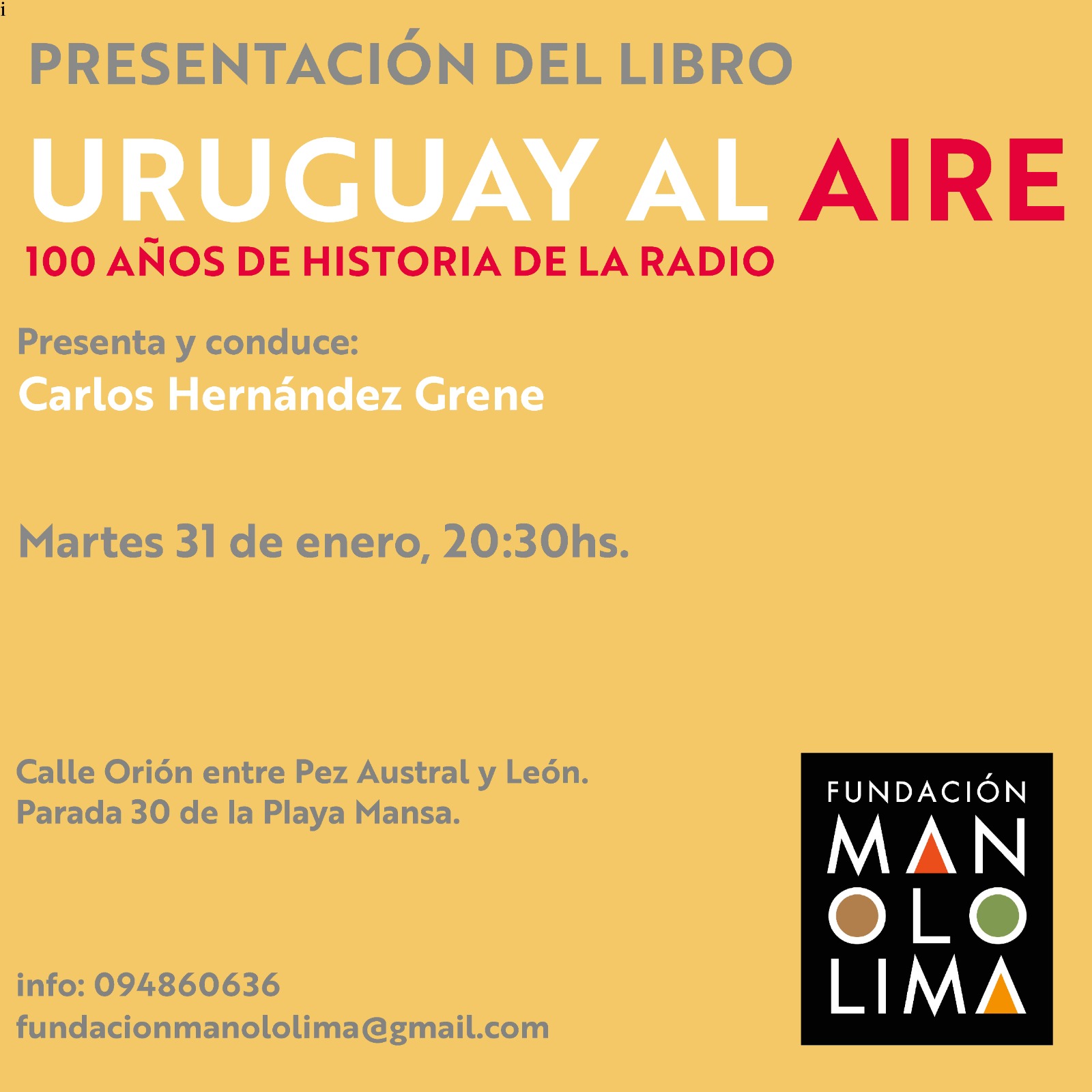 A cargo de uno de sus autores: Carlos Hernández Grene. 31/01 - Fundación Manolo Lima 03/02 - Azotea de Haedo
