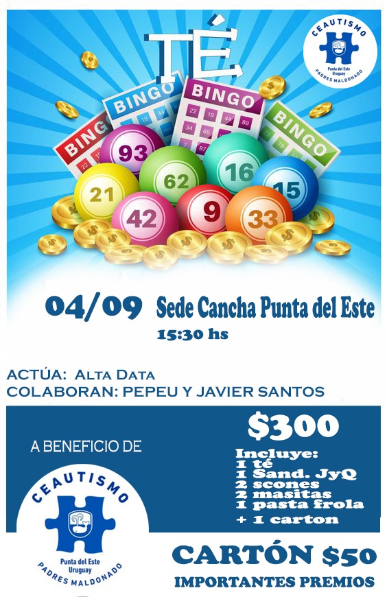 A beneficio de CEAUTISMO Maldonado - Punta del Este. Costo ticket Té: $ 300 (incluye 1 cartón) Costo cartón: $ 50