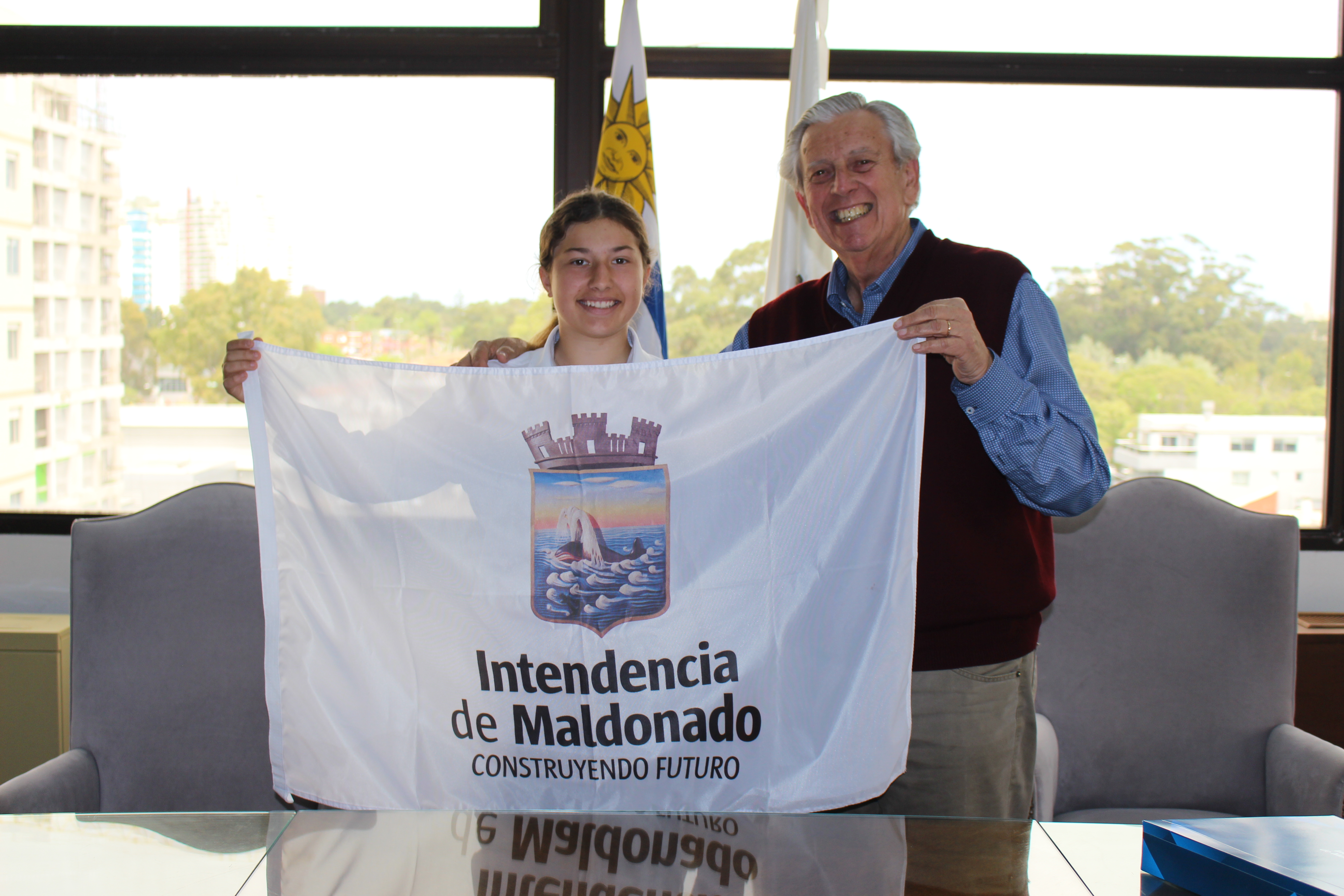 El secretario general de la IDM, Luis Eduardo Pereira, entregó la bandera del departamento a Paulina Sosa, quien viajará a Esteio para competir en la Final de Freno de Oro Juvenil -prueba reconocida internacionalmente de la raza de caballos criollos-.