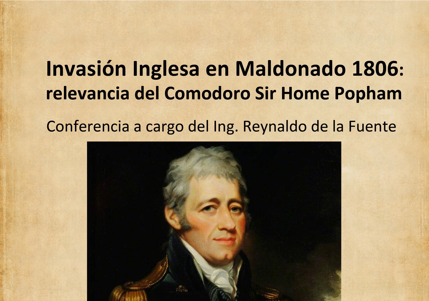 Bajo el título “Invasión Inglesa en Maldonado 1806: relevancia del Comodoro Sir Home Popham”, tiene como objetivo mostrar el contexto histórico de las guerras napoleónicas dónde Inglaterra debía actuar sobre la América Hispánica para evitar que los tesoros de oro y plata no terminaran en manos de Napoleón.