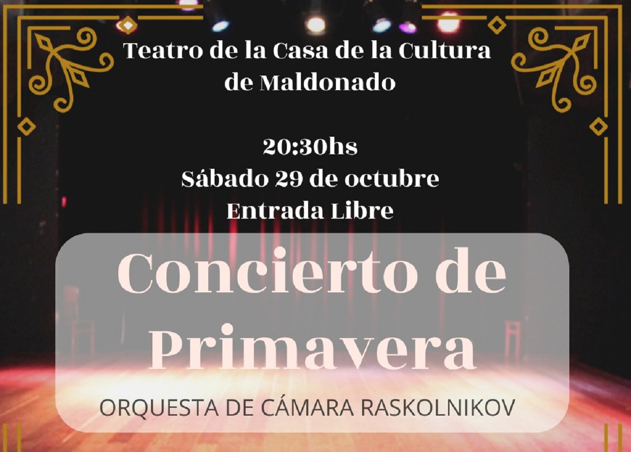 A partir de las 20.30 horas de este 29 de octubre se podrá asistir a un concierto que tendrá lugar en el Teatro de la Casa de la Cultura de Maldonado -en Rafael Pérez del Puerto y Román Guerra- con entrada gratuita.