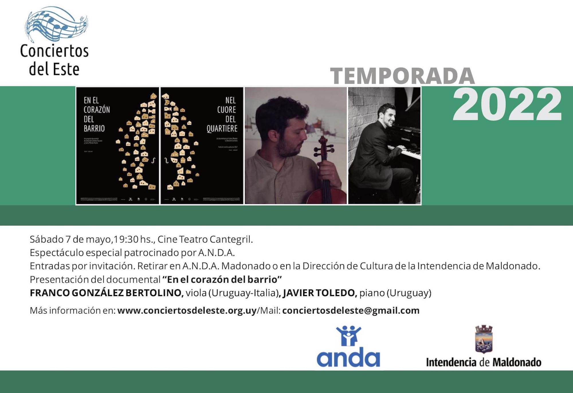 Se estrenará el documental italo-uruguayo "En el corazón del barrio" y actuarán los concertistas Franco González Bertolino en viola y Javier Toledo en piano que ejecutarán obras de Santorsola, Piazzolla y Galzunov, entre otros.