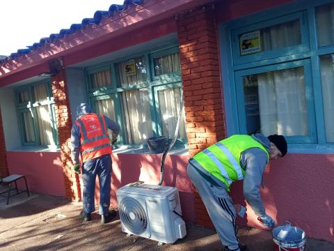 Los usuarios del programa de inserción sociolaboral, perteneciente a la Dirección de Adicciones de la Intendencia de Maldonado, realizaron trabajos de pintura en el muro, las rejas y la fachada de este centro educativo.
