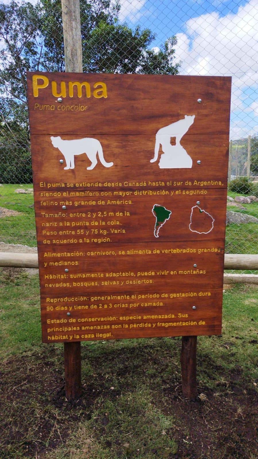 En el marco del ingreso de estas nuevas especies, la Estación de Cría de Fauna Autóctona “Tabaré Gonzales Sierra” dispuso nueva cartelería interpretativa homologada sobre los ejemplares (Puma concolor), la cual fue confeccionada por parte del equipo de guardaparques.