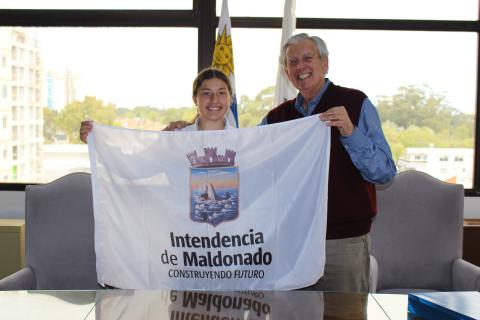 El secretario general de la IDM, Luis Eduardo Pereira, entregó la bandera del departamento a Paulina Sosa, quien viajará a Esteio para competir en la Final de Freno de Oro Juvenil -prueba reconocida internacionalmente de la raza de caballos criollos-.