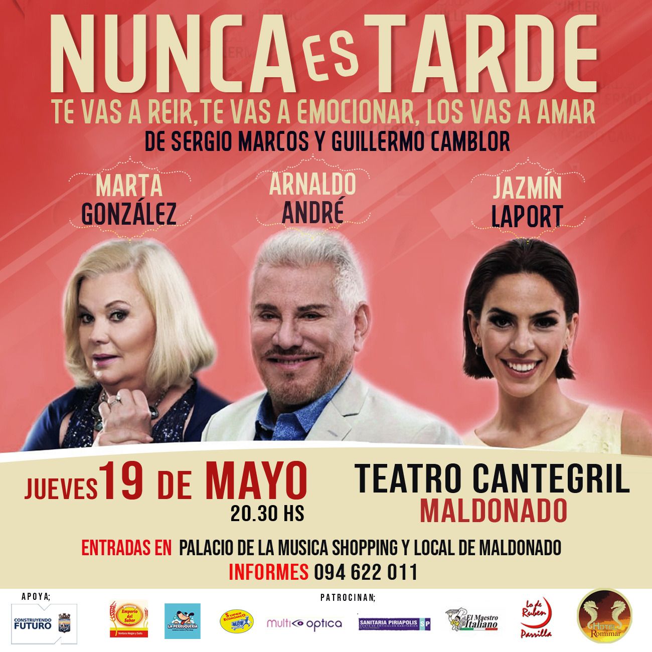 Se trata de una obra protagonizada por Arnaldo André, Jazmín Laport y Marta González, escrita por Sergio Marcos y Guillermo Camblor, que se presentará a las 20.30 horas de este jueves 19 de mayo en ese espacio cultural de Punta del Este.
