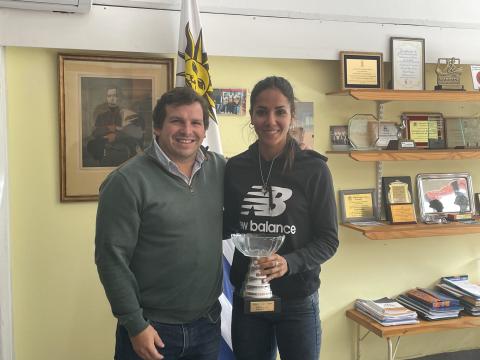 En agradecimiento por el apoyo brindado por la Dirección General de Deportes de la IDM, la atleta de Maldonado de 36 años le entregó el trofeo de la Media Maratón de Montevideo a Martín Hualde.