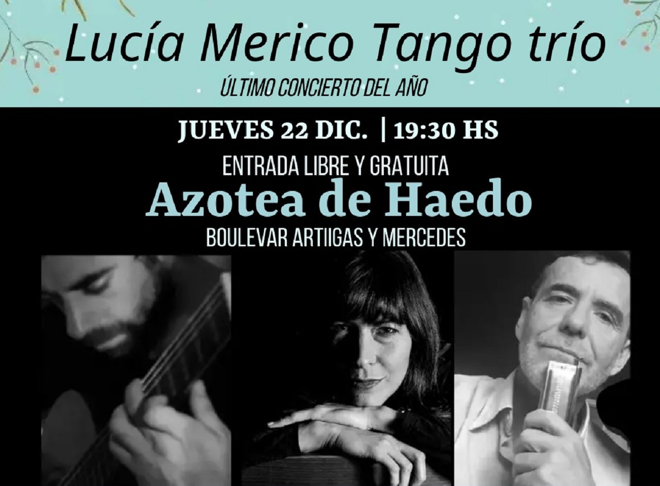 Se trata de una propuesta de tres artistas, de amplia trayectoria, unidos por la amistad y el amor a la música rioplatense: Lucía Mérico -voz-, Guzmán Escardó -guitarra, armónica y clarinete-, y Enzo Bonizi -en guitarra-.