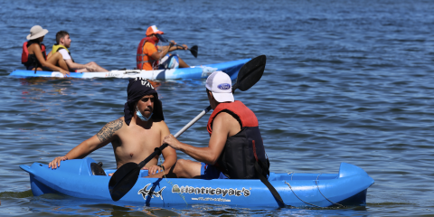 Personas con discapacidad y adultos mayores de diferentes organizaciones sociales disfrutaron de una gran jornada con paseos en kayak en la Playa Accesible, localizada en la Parada 8 de Playa Mansa.